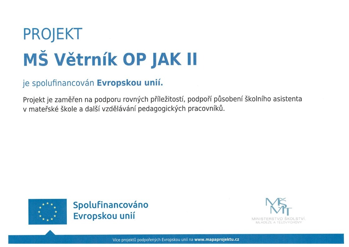 Naše mateřská škola stojí na klidném místě nedaleko centra. Naše prostorná zahrada umožňuje v létě hru dětí v samostatných koutech pro jednotlivé třídy, které jsou vybaveny pískovišti, domečky, skluzavkami a brouzdališti. Krásná lesní zákoutí vybízejí děti ke hrám s přírodninami. V zimě máme dostatek prostoru pro hry se sněhem a na mírném svahu přímo v areálu školy můžeme sáňkovat a pekáčovat. Máme zde také dopravní hřiště, velké hřiště pro míčové hry.